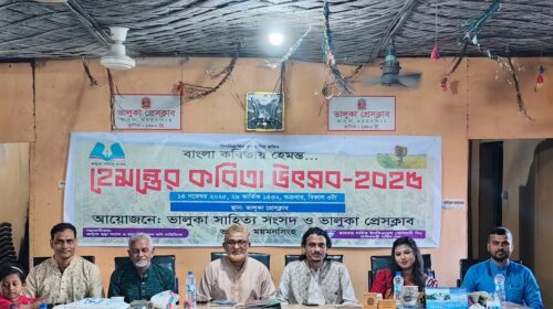 আব্দুল্লাহ আনছারী আকরাম ভালুকা(ময়মনসিংহ)প্রতিনিধি: ময়মনসিংহের ভালুকায় উৎসবমুখর পরিবেশে ভালুকা প্রেসক্লাব মিলনায়তনে অনুষ্ঠিত হলো হেমন্তের কবিতা উৎসব-২০২৫। শুক্রবার (১৪ নভেম্বর) বিকেল তিনটা থেকে রাত আটটা পর্যন্ত“বাংলা কবিতায় হেমন্ত” শীর্ষক এই আয়োজন…